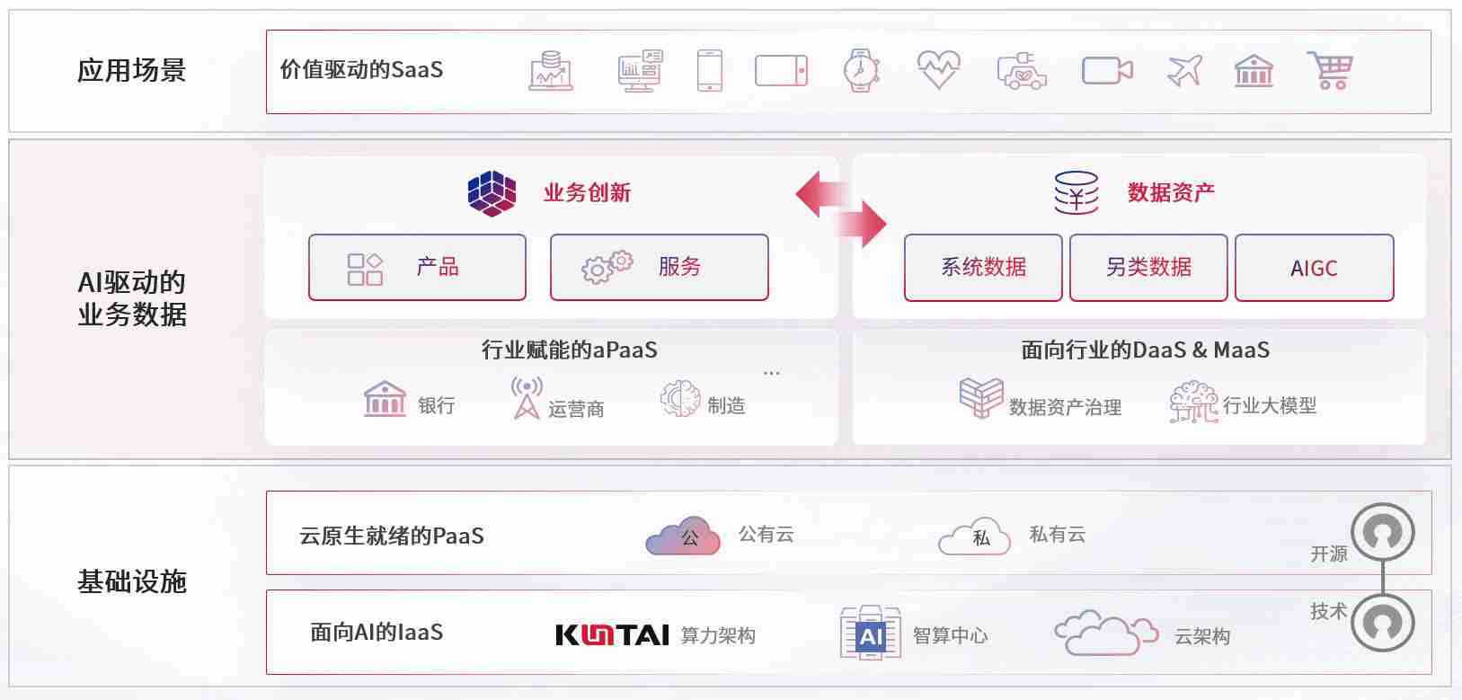 数字时代,,围绕企业数字化转型的关键要素,,,NO钱包数码开创性的提出数云融合战略和技术体系框架,,,,着力在云原生、、、、数字原生、、、AI原生和信创产业上架构产品和服务能力,,为处在不同数字化转型阶段的快消零售、、、汽车、、、金融、、、医疗、、、政企、、、、教育、、、、运营商等行业客户提供泛在的敏捷IT能力和融合的数据驱动能力,,构建跨界融合创新的数字业务场景和新业务模式,,,助力企业级客户建立面向未来的核心能力和竞争优势,,,全面推动社会的数字化、、、、智能化转型升级。。。