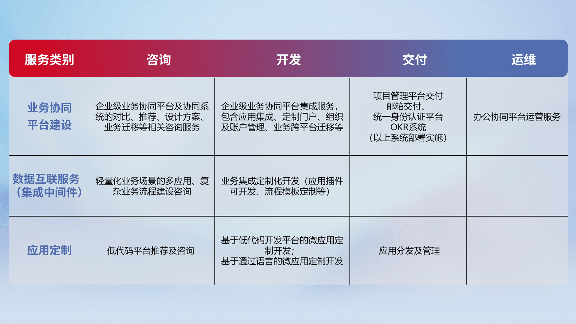 针对钉钉、、、企微、、、IDaas等平台级产品提供产品的规划、、方案、、、交付、、定制化开发等服务,,,实现如统一协同办公、、智能客户服务、、混合会议管理、、智能数据查询、、、等业务场景,,,实现数字化转型。。。。